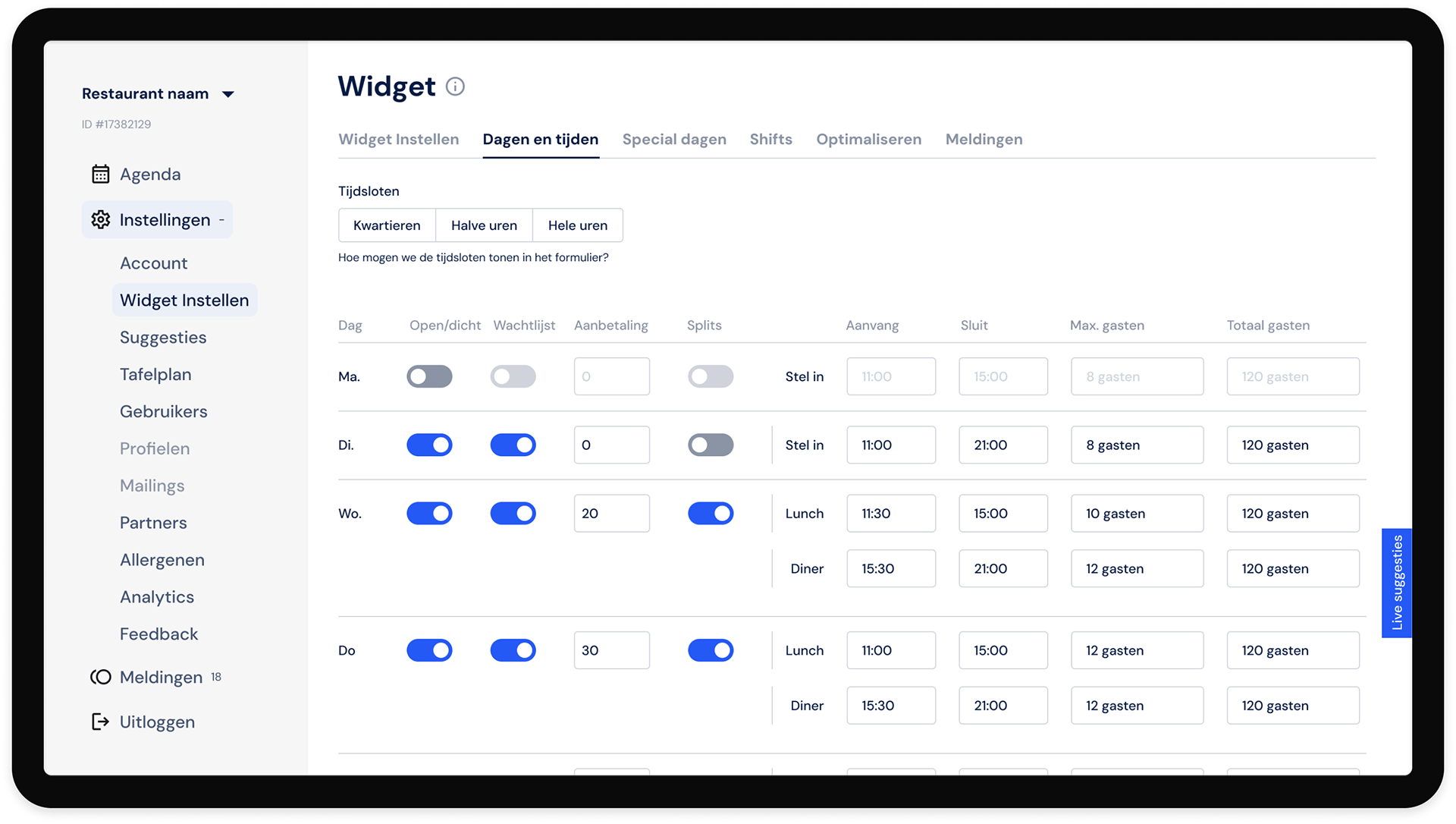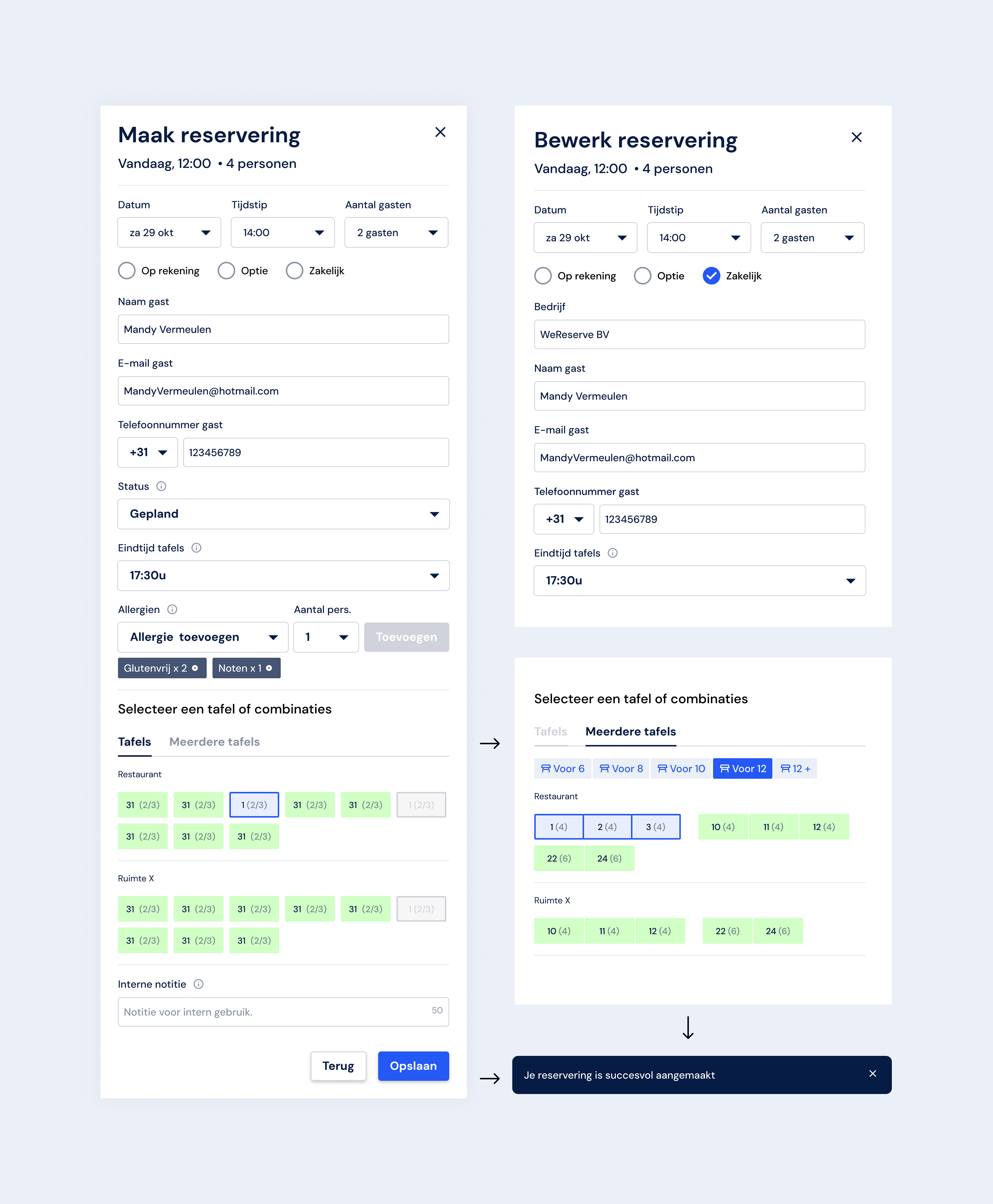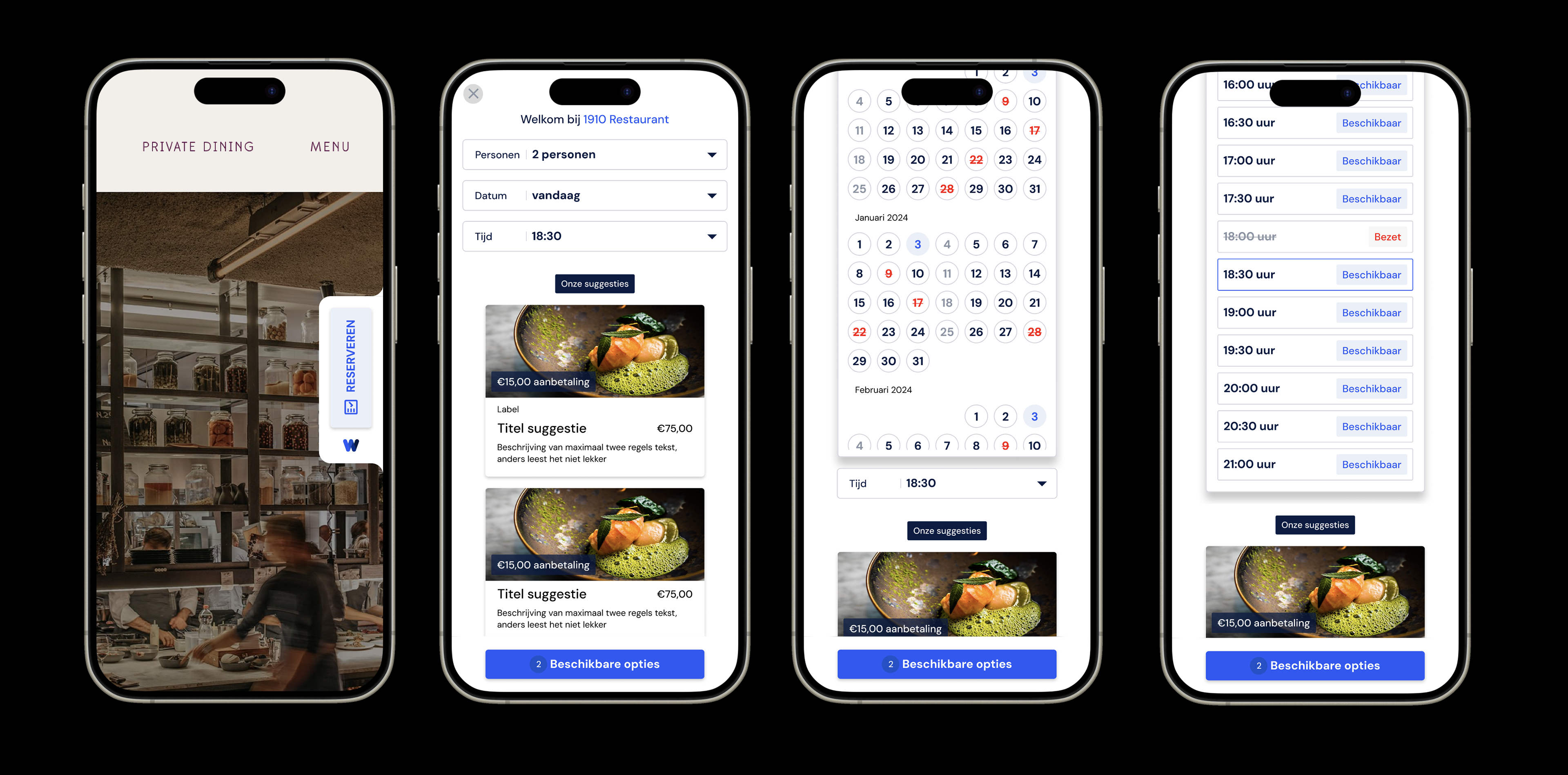 Restaurant customers can book a table through a WeReserve Widget on the website of the restaurant. The restaurant can configure the widget to their needs. They can show the availability of tables, types of seats, opening times and more.