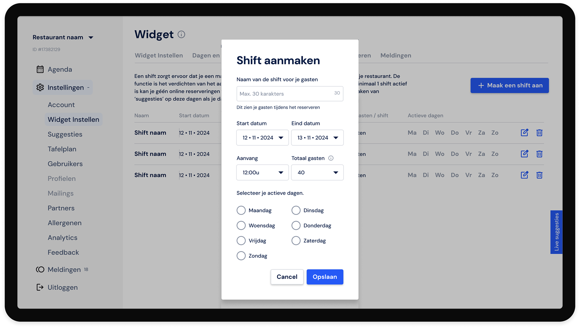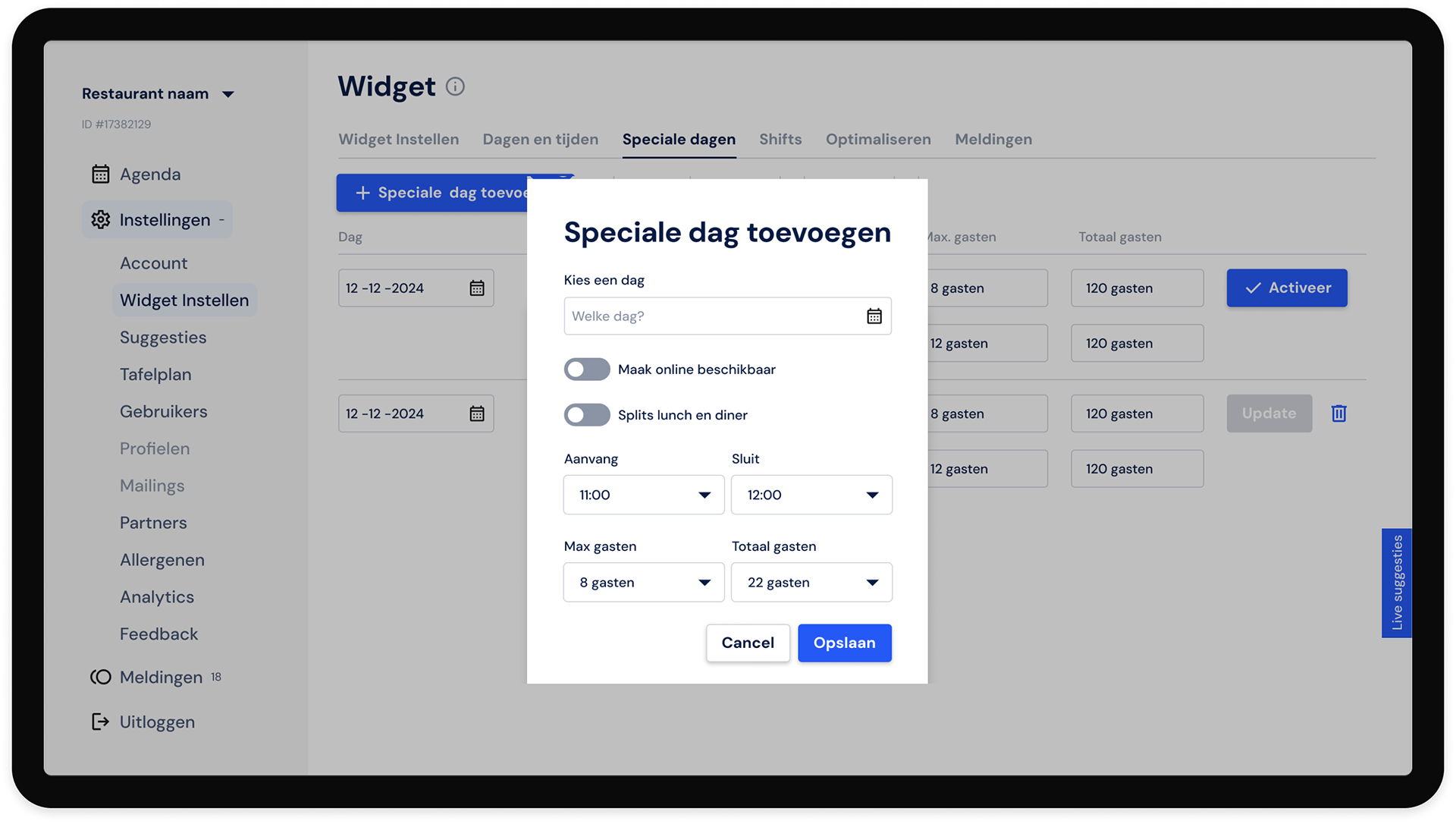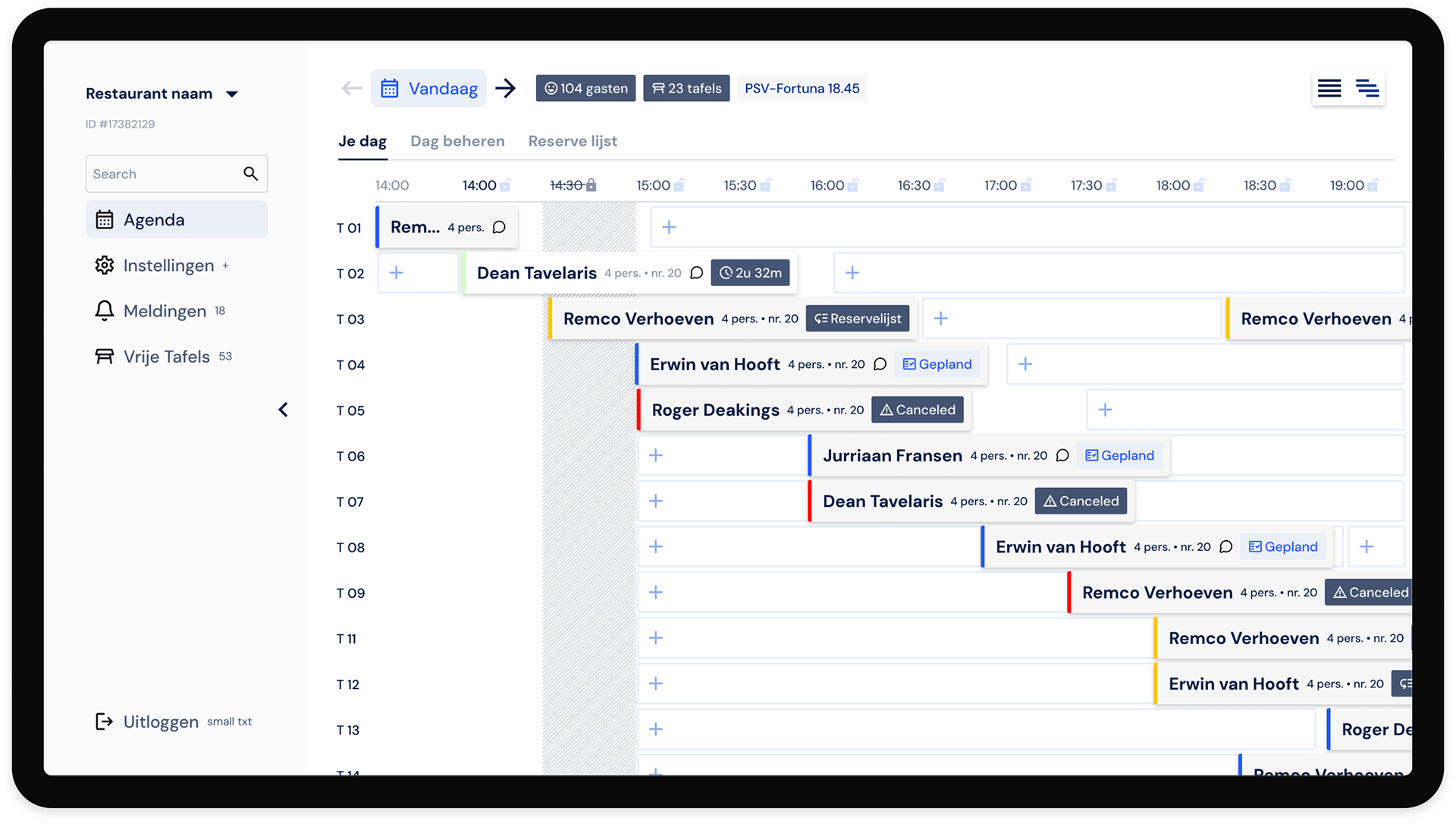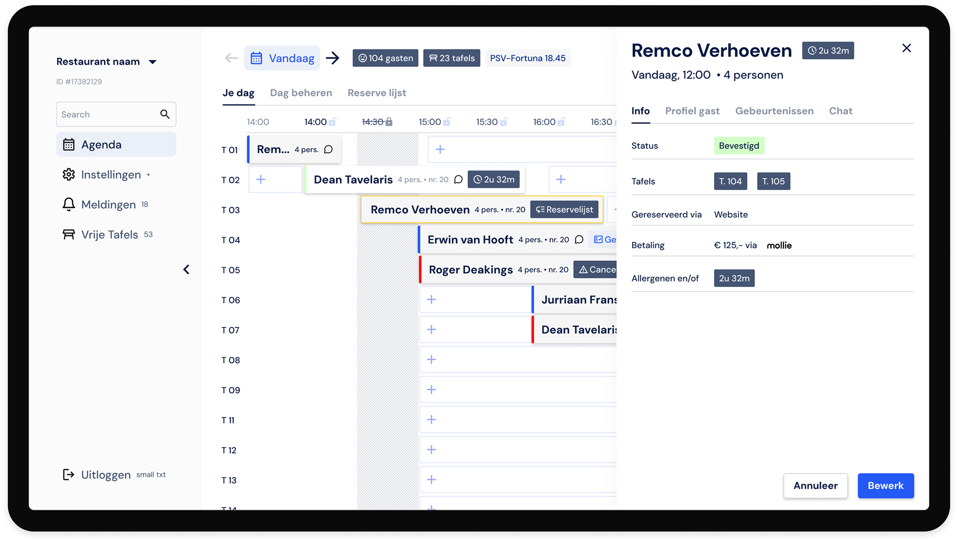 Restaurant owners are able to manage their restaurants from WeReserve. In the agenda all appointments can be viewed, per table they can plan who sits where. Manage the waitlist and update cancelations.